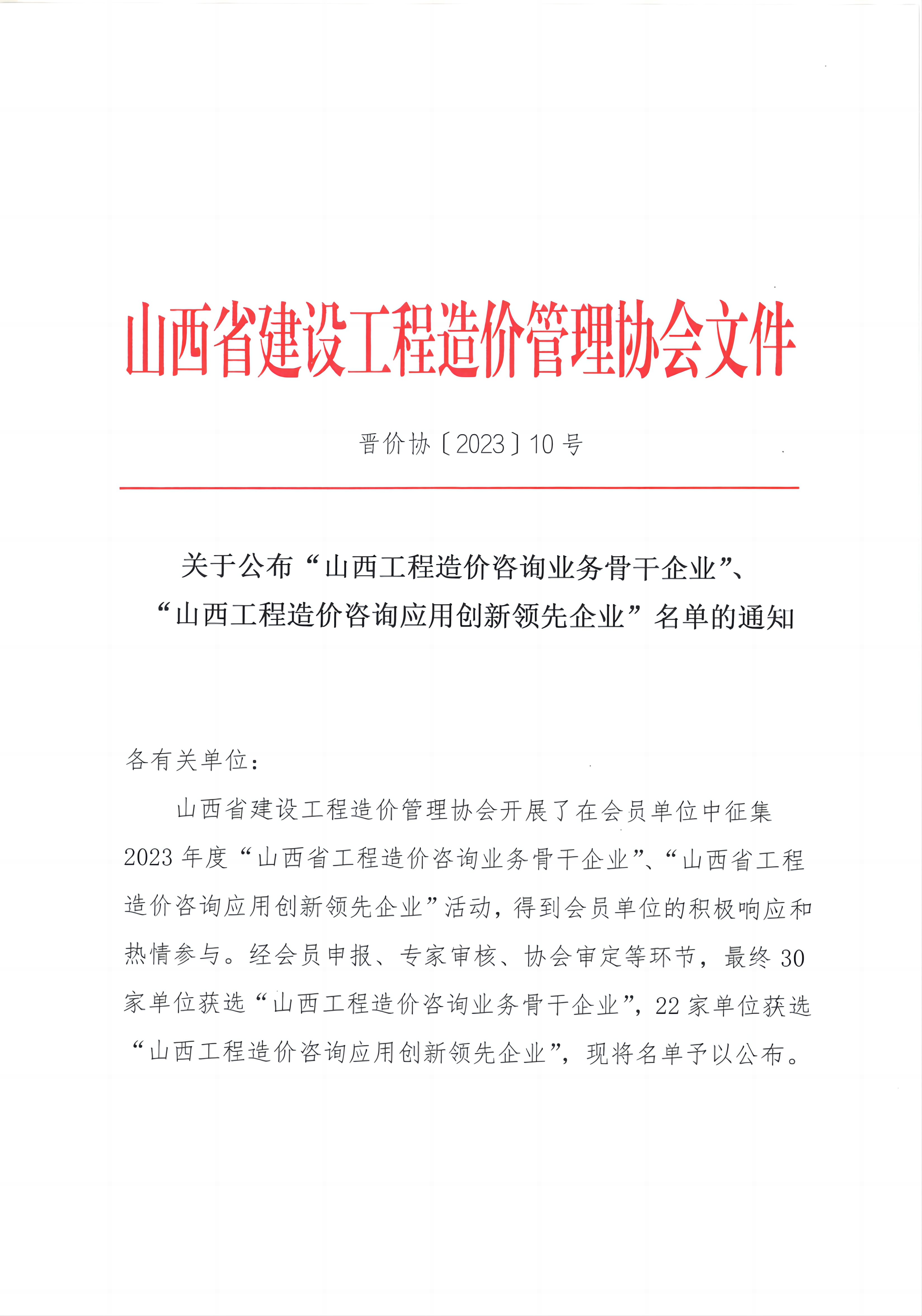 2023年,省價(jià)協(xié)開(kāi)展2023年度“山西省工程造價(jià)咨詢(xún)業(yè)務(wù)骨干企業(yè)”、“山西省工程造價(jià)咨詢(xún)應(yīng)用創(chuàng)新領(lǐng)先企業(yè)"活動(dòng),我公司積極參與申報(bào),經(jīng)省價(jià)協(xié)初審、專(zhuān)家評(píng)審,最終,我公司入選2023年度“山西省工程造價(jià)咨詢(xún)業(yè)務(wù)骨干企業(yè)”。
